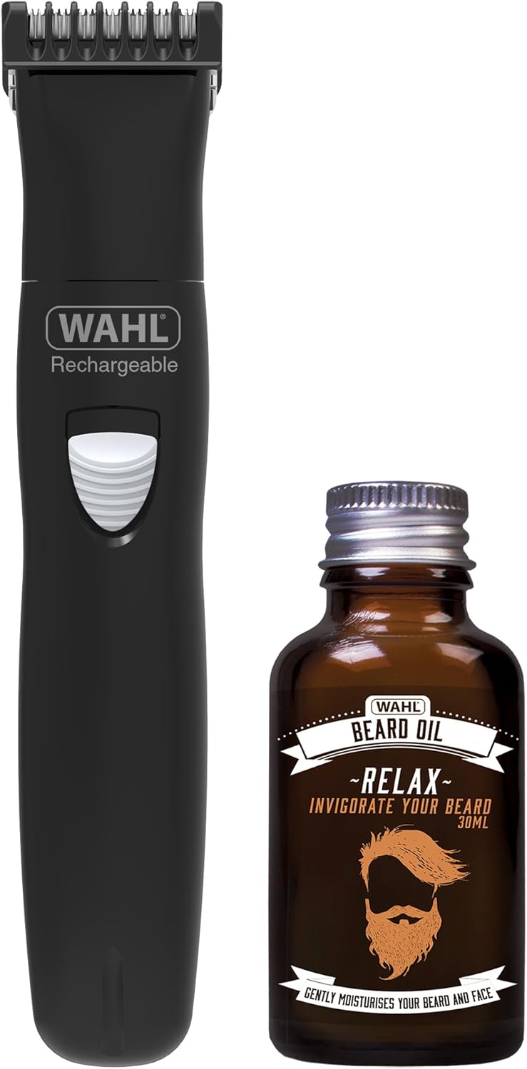 The trimmer features ergonomic design for comfortable grip and control during use. Its compact size makes it travel-friendly, while the rechargeable battery delivers long-lasting power for multiple grooming sessions. The included beard oil is packaged in a precisely measured bottle, ensuring easy application and lasting supply.