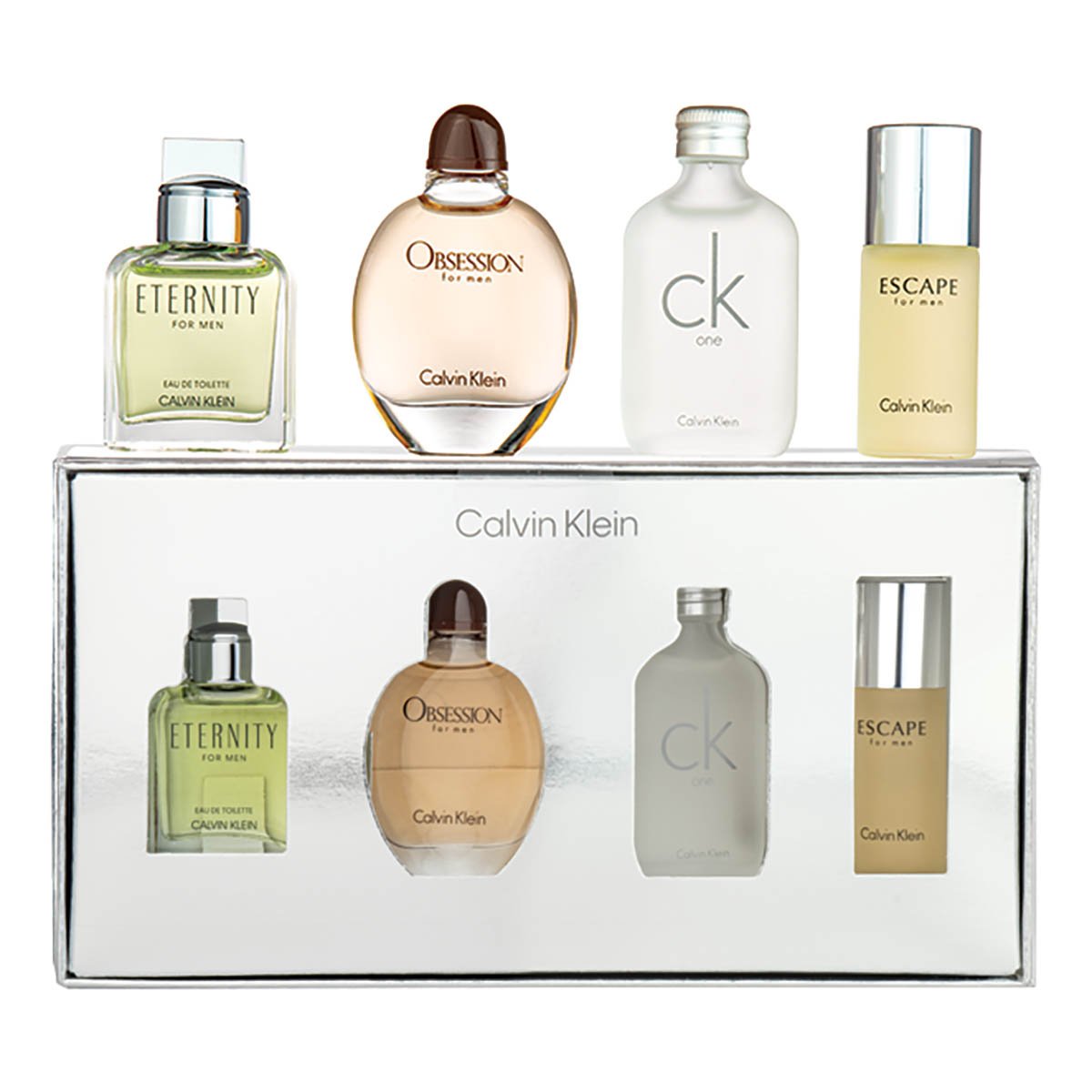 • Includes four 15 ml miniature bottles of classic Calvin Klein fragrances: Eternity EDT, Obsession EDT, CK One EDT, and Escape EDT.