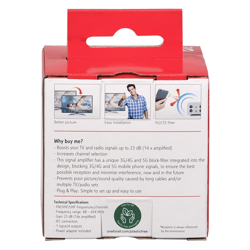 Introducing the One For All SV9604, your ultimate solution for enhanced TV signal reception and distribution. In an age where quality entertainment is paramount, the SV9604 ensures that you enjoy the best possible viewing experience without interruptions or loss of signal quality. This versatile 4-way TV signal booster and splitter is designed to amplify your TV signal while filtering out unwanted 4G interference, allowing you to enjoy crystal-clear picture quality and sound across multiple devices in your home.