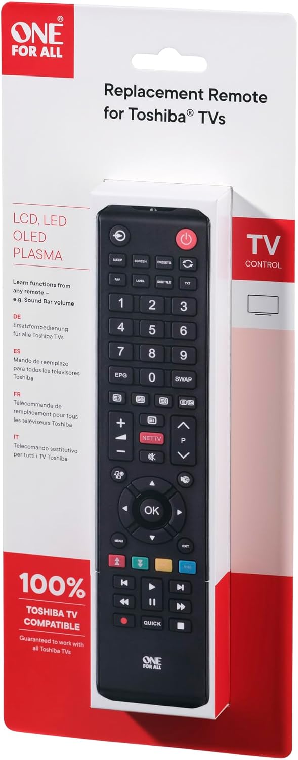 Restore full control of your Toshiba TV with the One For All URC1919 Replacement Remote. Designed for seamless compatibility, it offers intuitive button layout and reliable signal transmission. Save money with this cost-effective alternative to original remotes, now available at a discounted price. Experience hassle-free operation and precise response for all your TV functions in one compact device.