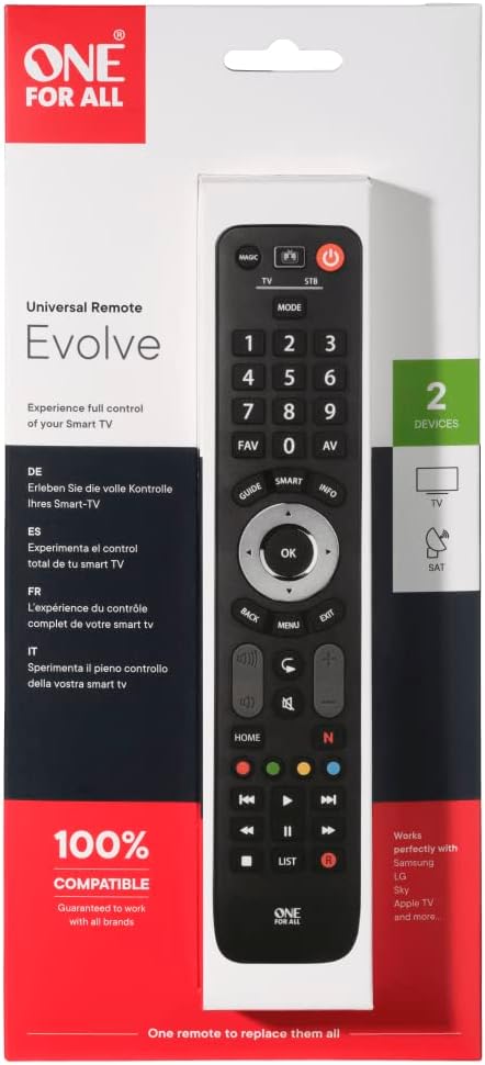 The One For All URC7125 Evolve 2-in-1 Remote Control streamlines your home entertainment by integrating control for two devices into a single, easy-to-use remote. Ideal for reducing clutter and improving convenience, it delivers reliable operation and intuitive control.