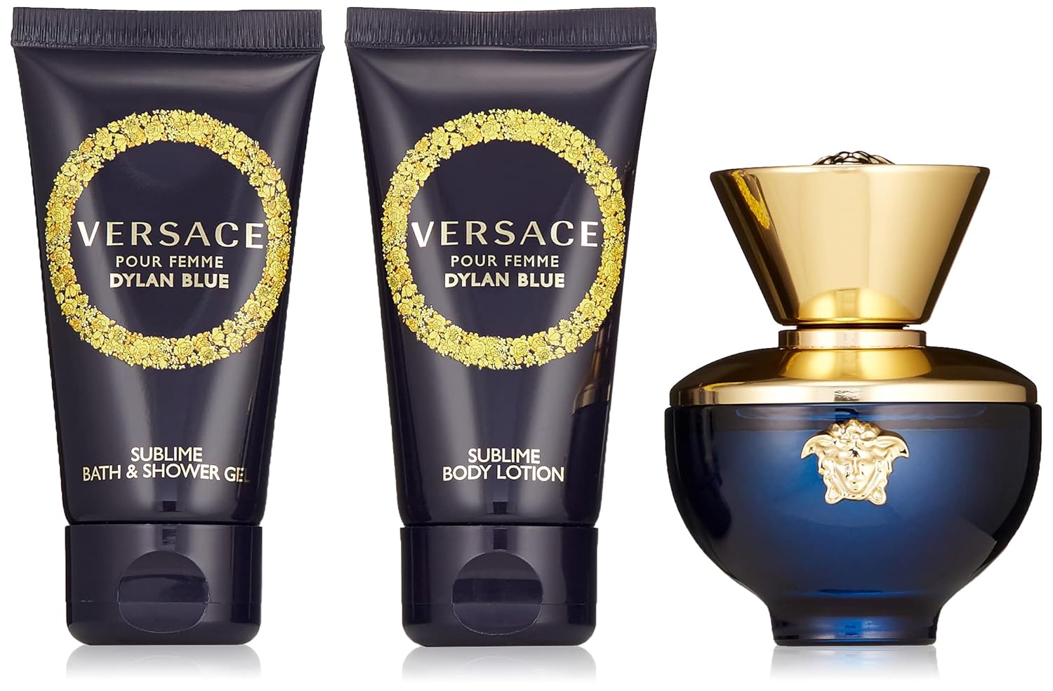 Experience luxury with the Versace Pour Femme Dylan Blue Gift Set, featuring a 50 ml EDP, 50 ml Body Lotion, and 50 ml Shower Gel for a complete indulgence.