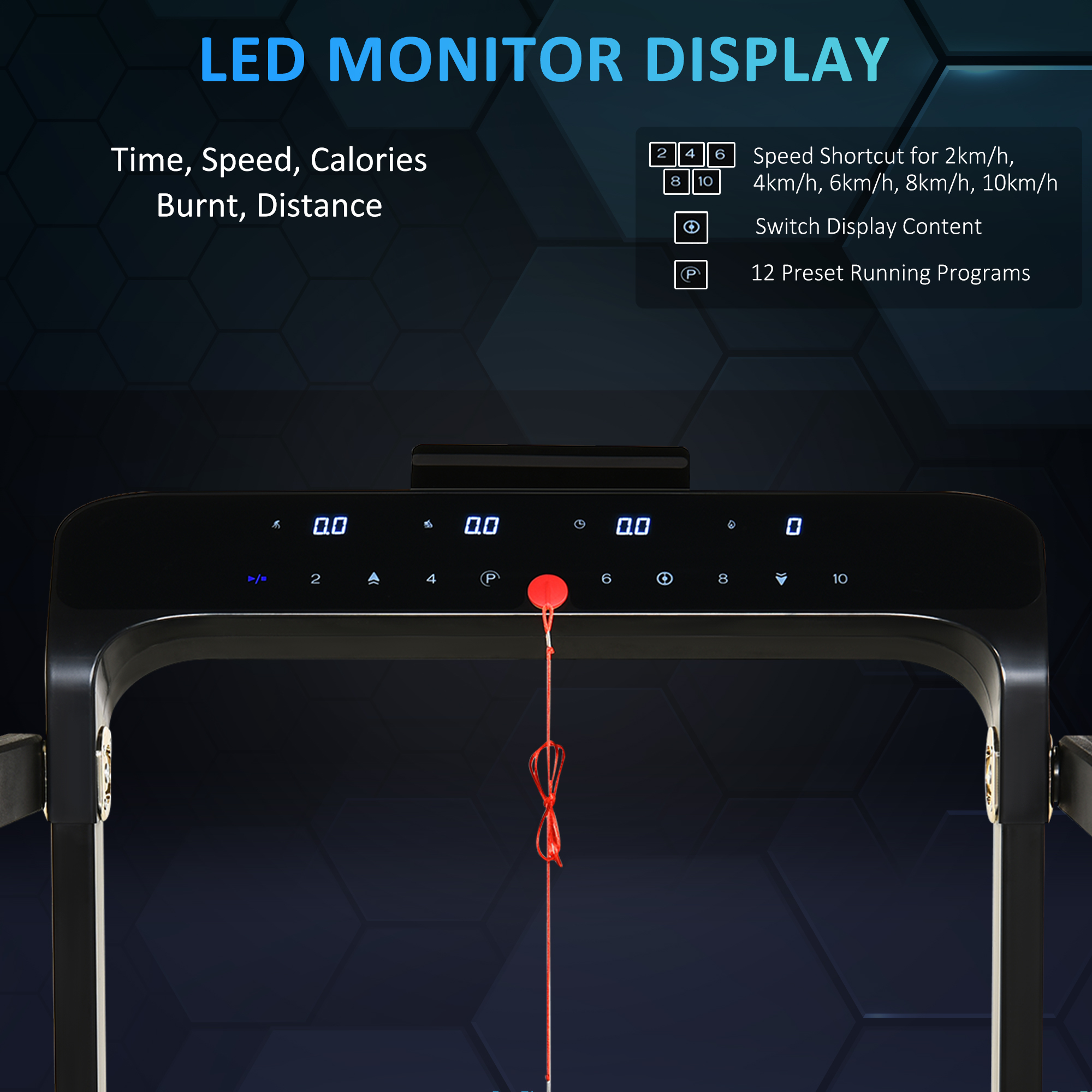 - User-friendly LED screen displaying time, speed, distance, and calories burned.