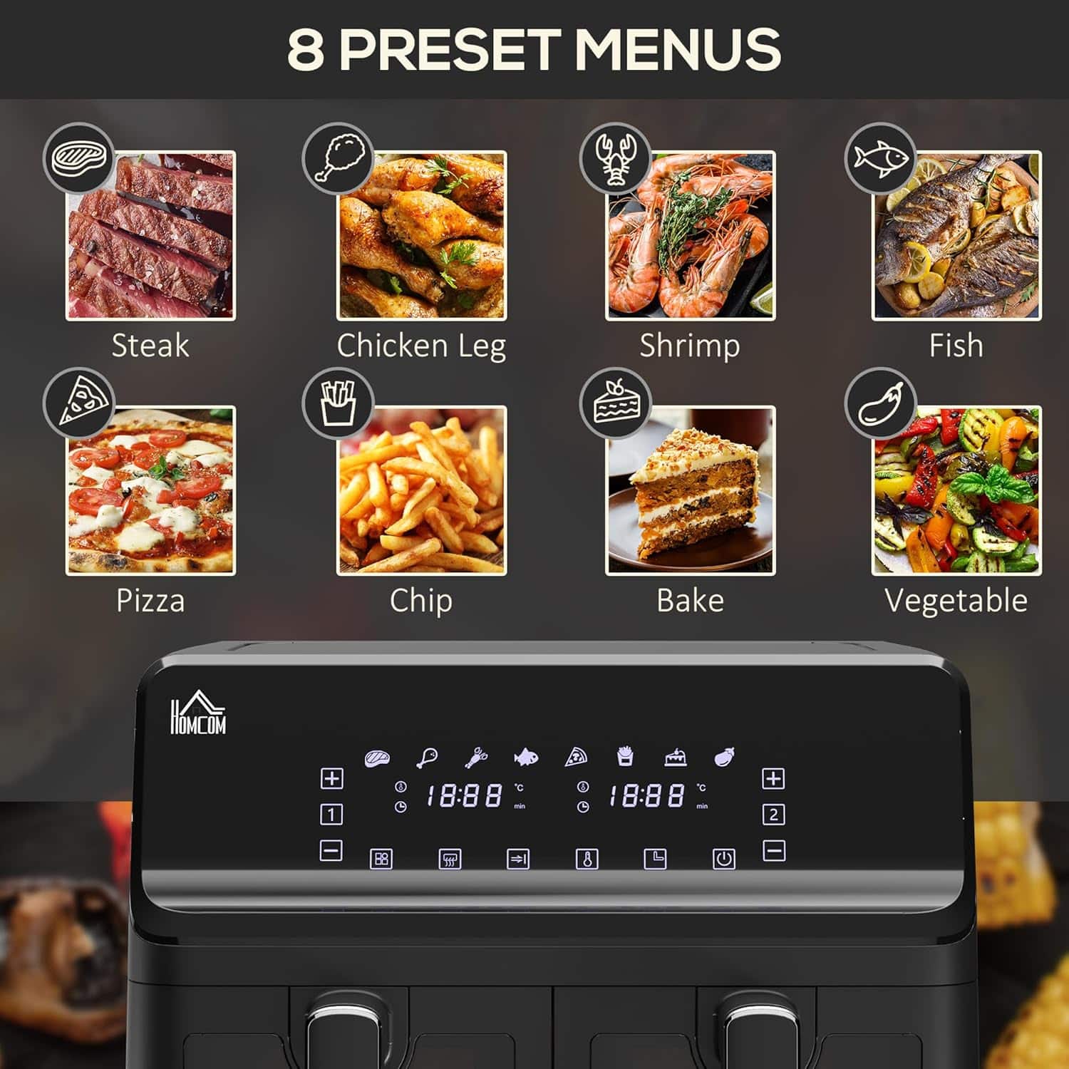 Using the Homcom Dual Air Fryer is simple and enjoyable. Just select your desired cooking preset, set the timer, and let the fryer do the work. Whether you’re whipping up crispy fries, succulent chicken wings, or roasted vegetables, this air fryer will help you create delicious, guilt-free meals in no time. The user-friendly interface and digital display make it easy to adjust settings, ensuring you have full control over your cooking process.