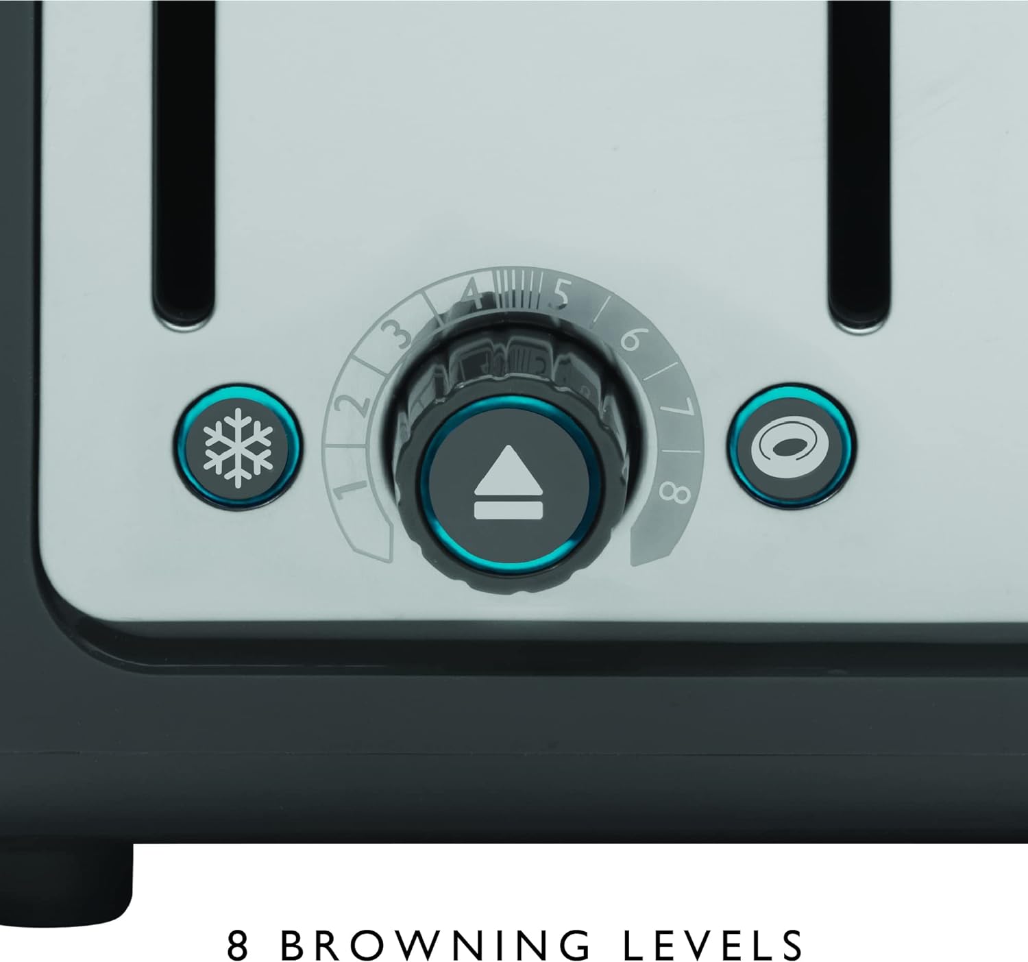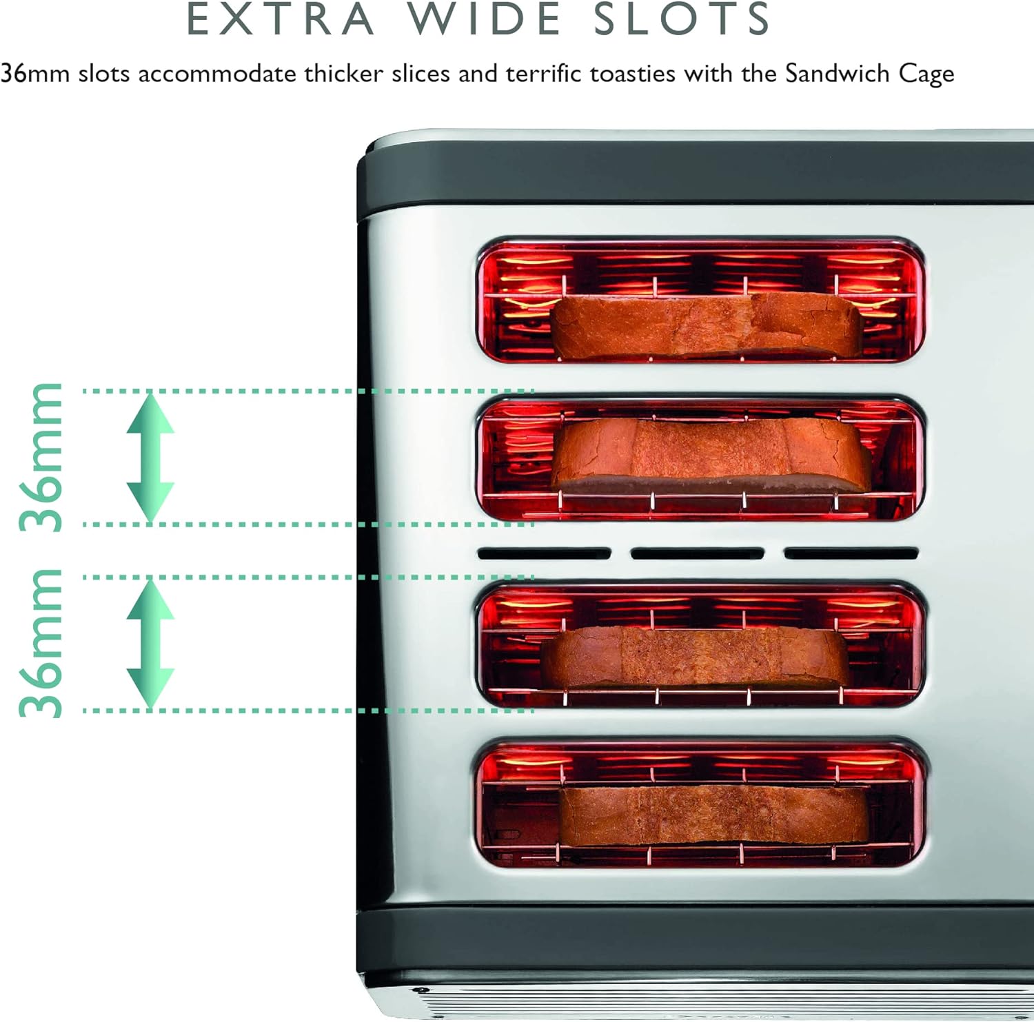 - Four extra-wide slots, accommodating various bread types, from thick artisan slices to bagels.