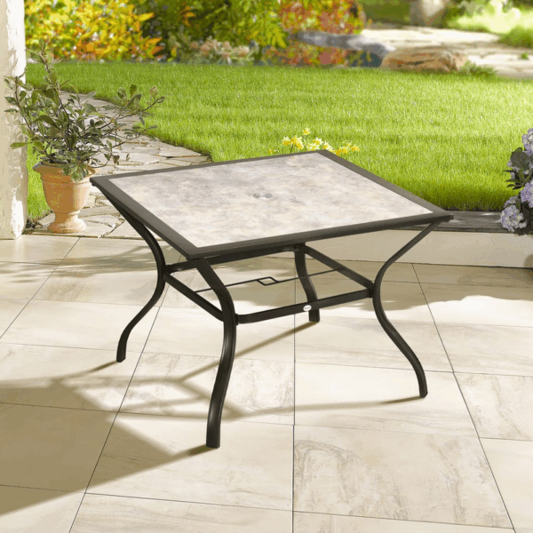 Stylish garden table for 4 with parasol hole; perfect for outdoor gatherings.