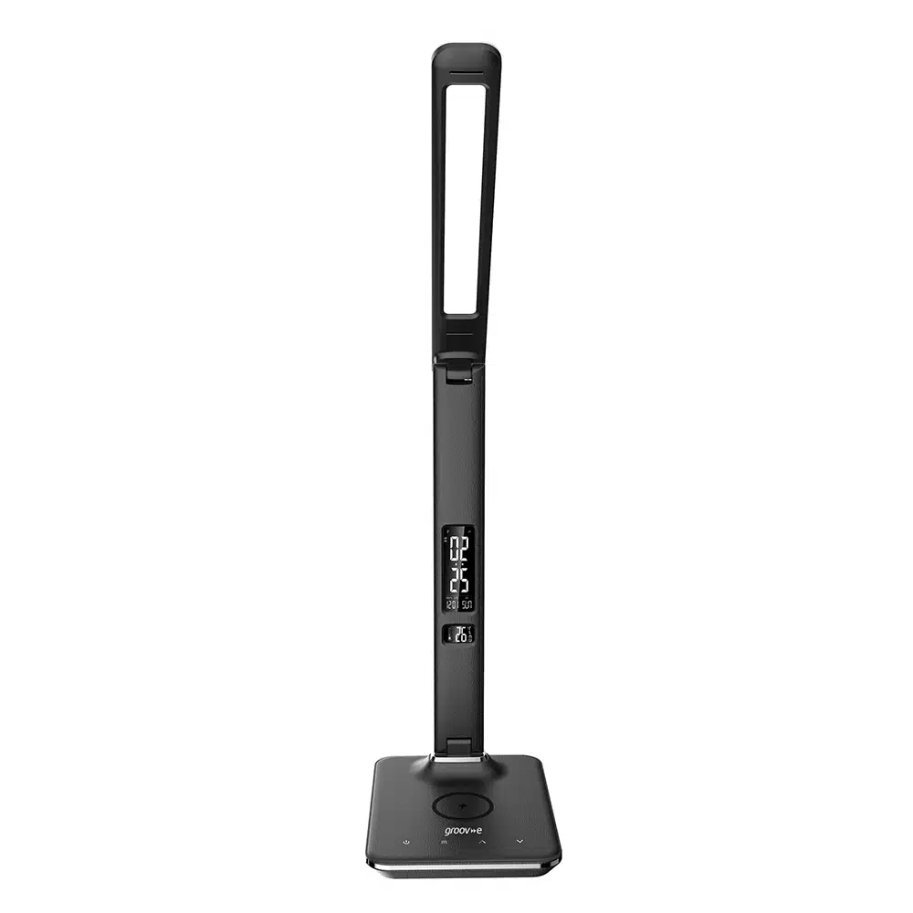 Illuminate your workspace with the Groov-e Ares Desk Lamp featuring wireless charging and a clock.