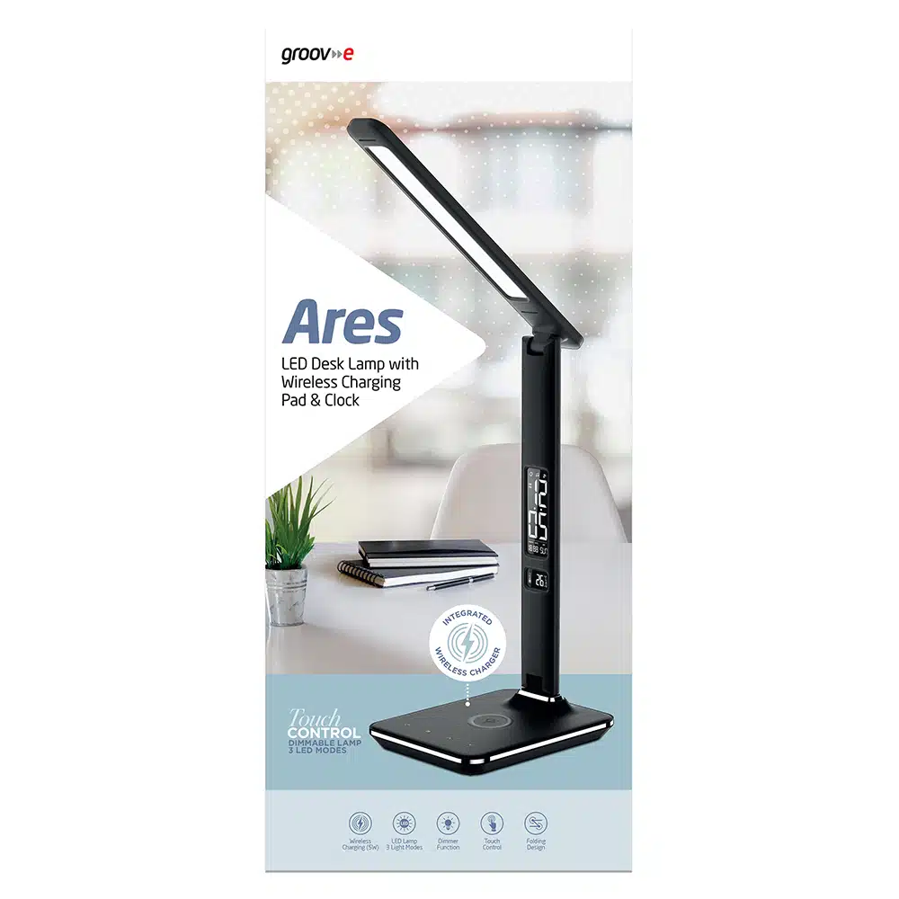 Elevate your workspace with the Groov-e GVWC04 BK Ares Desk LED Lamp with Wireless Charging Pad & Clock, and experience the perfect combination of light, technology, and style.