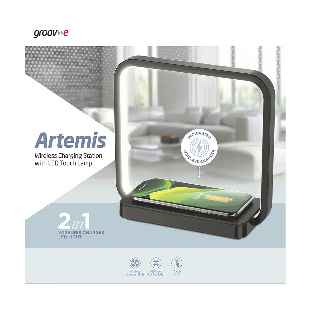 Illuminate your space with the Groov-e Artemis LED Touch Lamp, featuring a wireless charging pad.