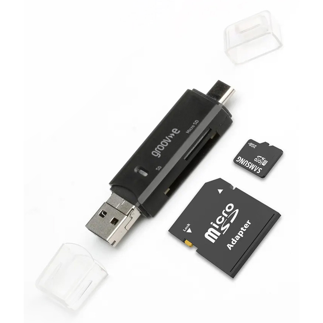 Groov-e GVPC08BK SD & Micro SD Memory Card Reader with USB-C, USB-A, Micro-USB Connetors