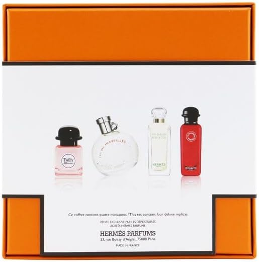 - Includes four 7.5 ml miniatures: Un Jardin Sur Le Nil EDT, Eau des Merveilles EDT, Twilly d'Hermes EDP, and Eau de Rhubarbe Ecarlate EDC.