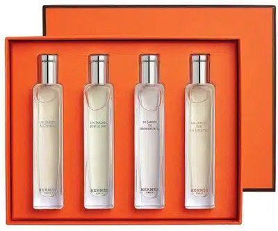 Indulge in luxury with the Hermes Jardin Collection Travel Set—four exquisite scents.