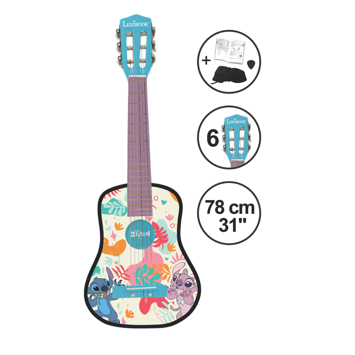 Strum along with Disney's Stitch! This 78 cm acoustic guitar inspires creativity and fun.