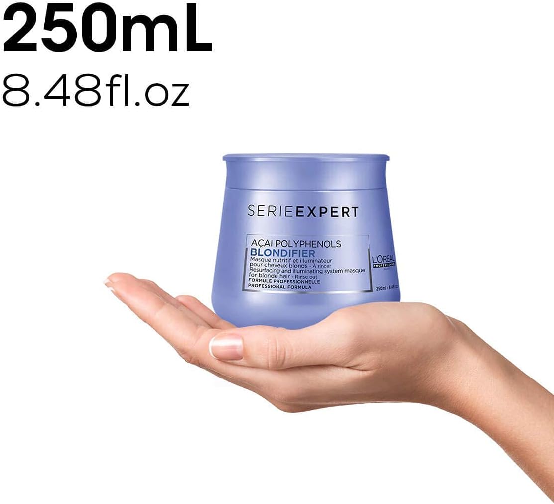 Introducing the L'Oreal Serie Expert Blondifier Hair Mask, a luxurious treatment designed specifically for blonde and highlighted hair. This professional-grade mask is formulated to enhance the brilliance and vibrancy of your blonde locks while providing essential nourishment. With its unique blend of ingredients, it helps to maintain the radiance of your color while protecting your hair from damage, leaving it soft, shiny, and beautifully bright.