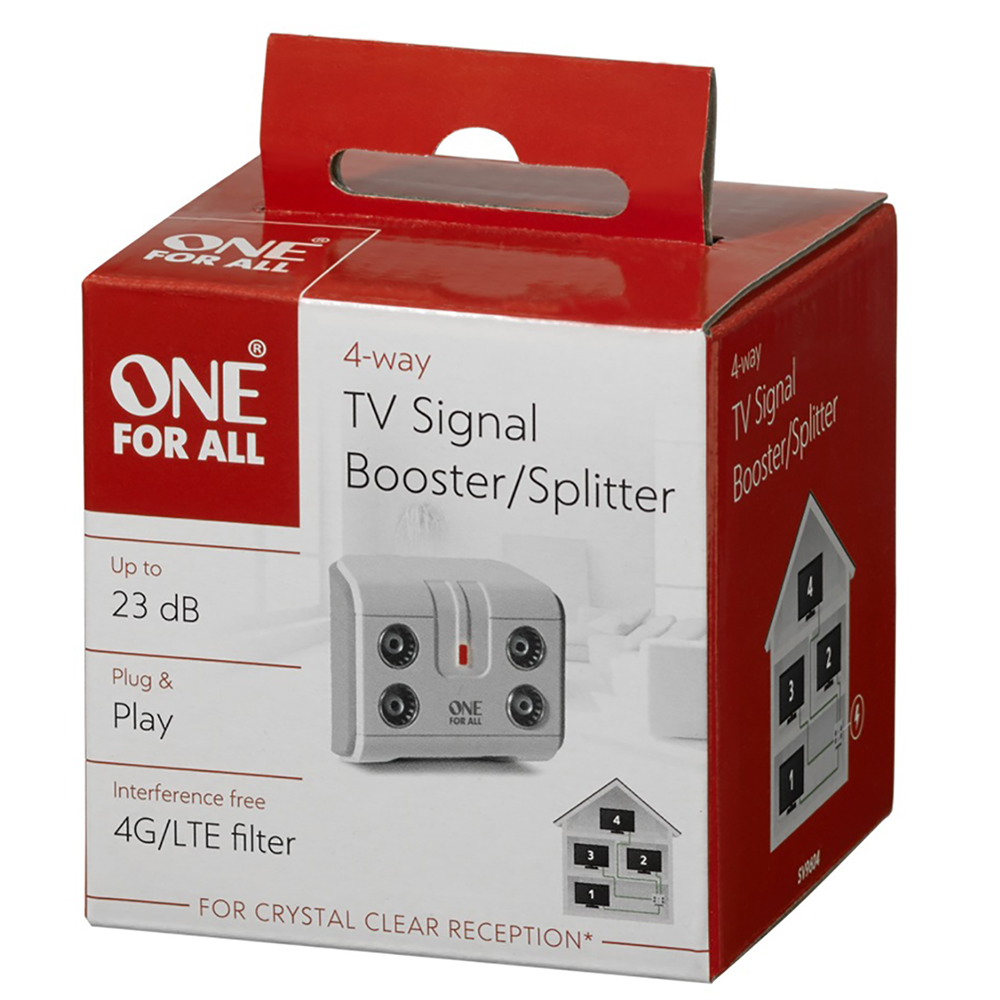Introducing the One For All SV9604, your ultimate solution for enhanced TV signal reception and distribution. In an age where quality entertainment is paramount, the SV9604 ensures that you enjoy the best possible viewing experience without interruptions or loss of signal quality. This versatile 4-way TV signal booster and splitter is designed to amplify your TV signal while filtering out unwanted 4G interference, allowing you to enjoy crystal-clear picture quality and sound across multiple devices in your home.