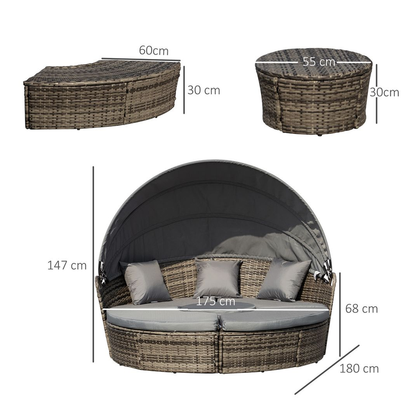 Introducing the Outsunny 5 PCs Cushioned Outdoor Plastic Rattan Round Sofa Bed Table Set in Grey, your ultimate solution for transforming any outdoor space into a luxurious oasis of relaxation and style. This stunning set combines comfort and elegance, making it the perfect addition to your garden, patio, or balcony. With its modern design and practical features, you can enjoy the great outdoors in ultimate comfort.