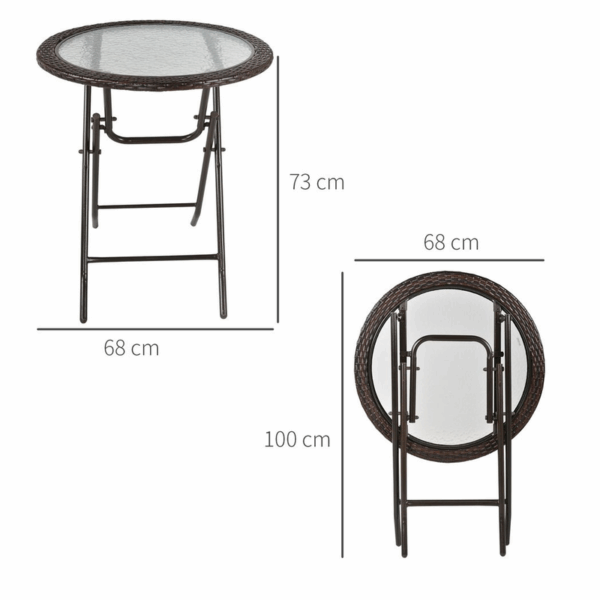 Introducing the Outsunny Folding Round Tempered Glass Metal Table with Brown Rattan Edging, the perfect blend of style, functionality, and sophistication for your outdoor and indoor spaces. This stunning table is designed to enhance your dining experience, whether you are hosting a summer barbecue or enjoying a quiet cup of coffee on your patio. With its elegant design and durable construction, it promises to be a versatile addition to your home.