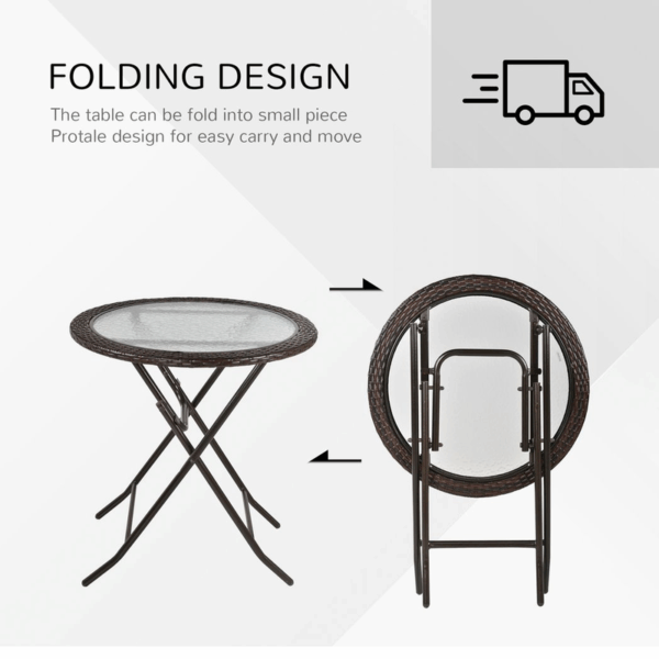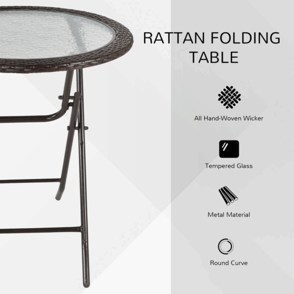 Outsunny Folding Round Tempered Glass Metal Table with Brown Rattan Edging