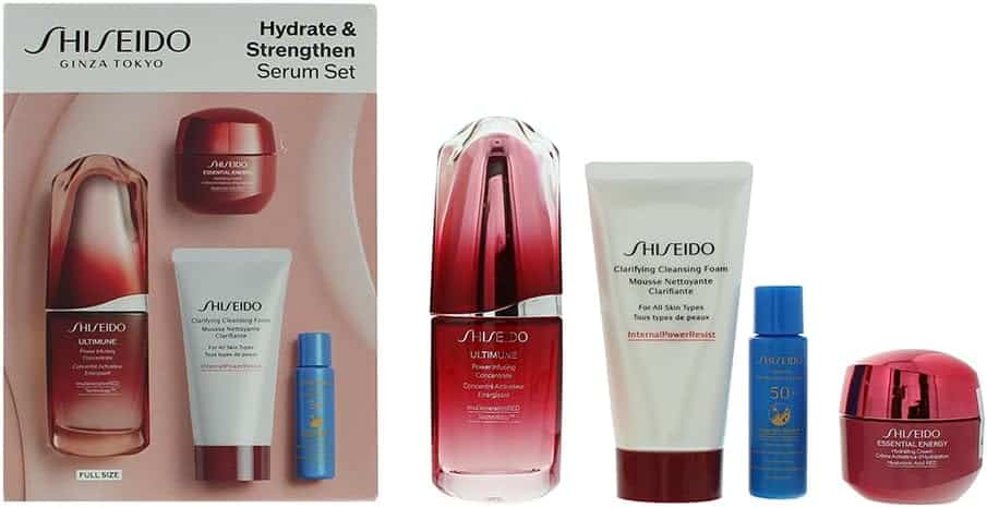 - Includes four premium Shiseido Ultimune products: Ultimune Power Infusing Concentrate, Ultimune Eye Power Infusing Eye Concentrate, Ultimune Moisturizing Gel Cream, and Ultimune Hydra Boosting Serum.