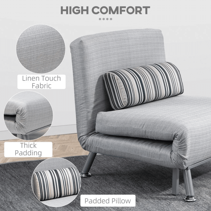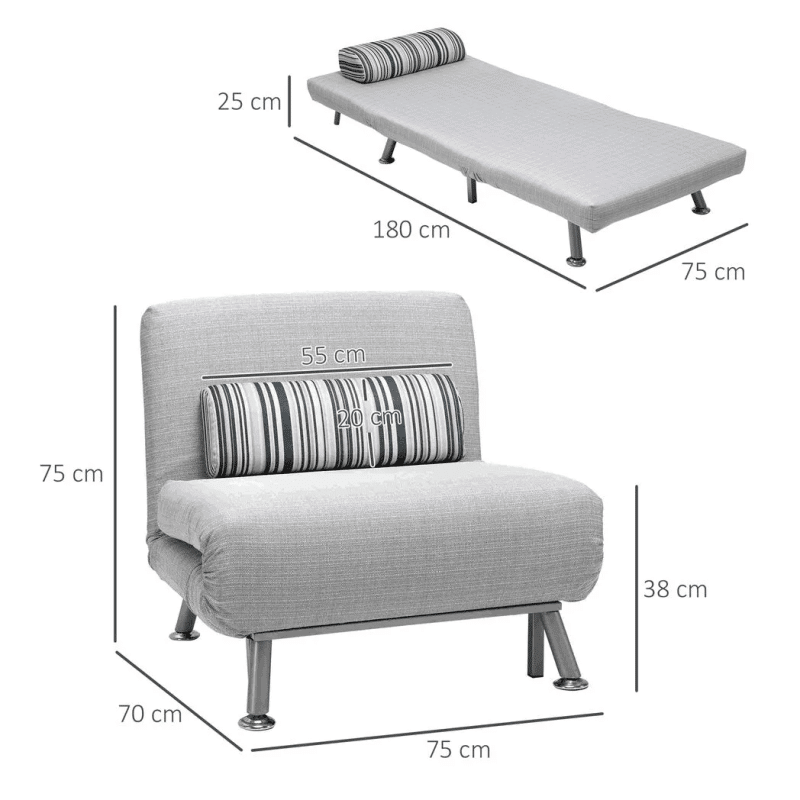 - Materials: The chair bed is crafted with a robust steel frame for structural integrity, covered in premium fabric for a soft touch, and filled with high-density foam for maximum comfort.