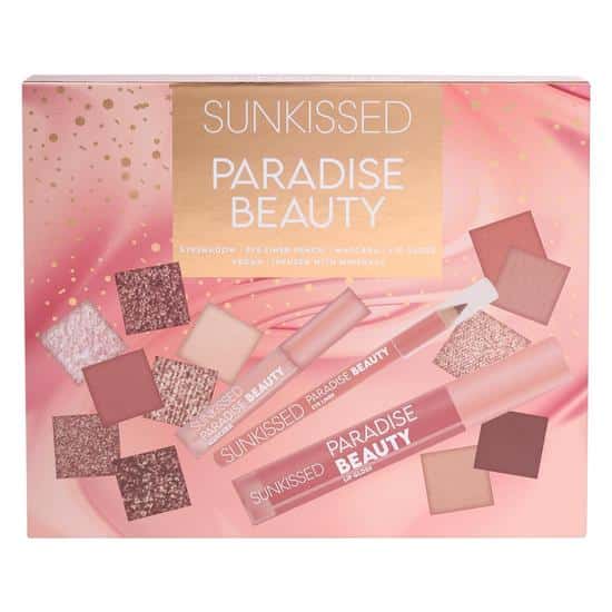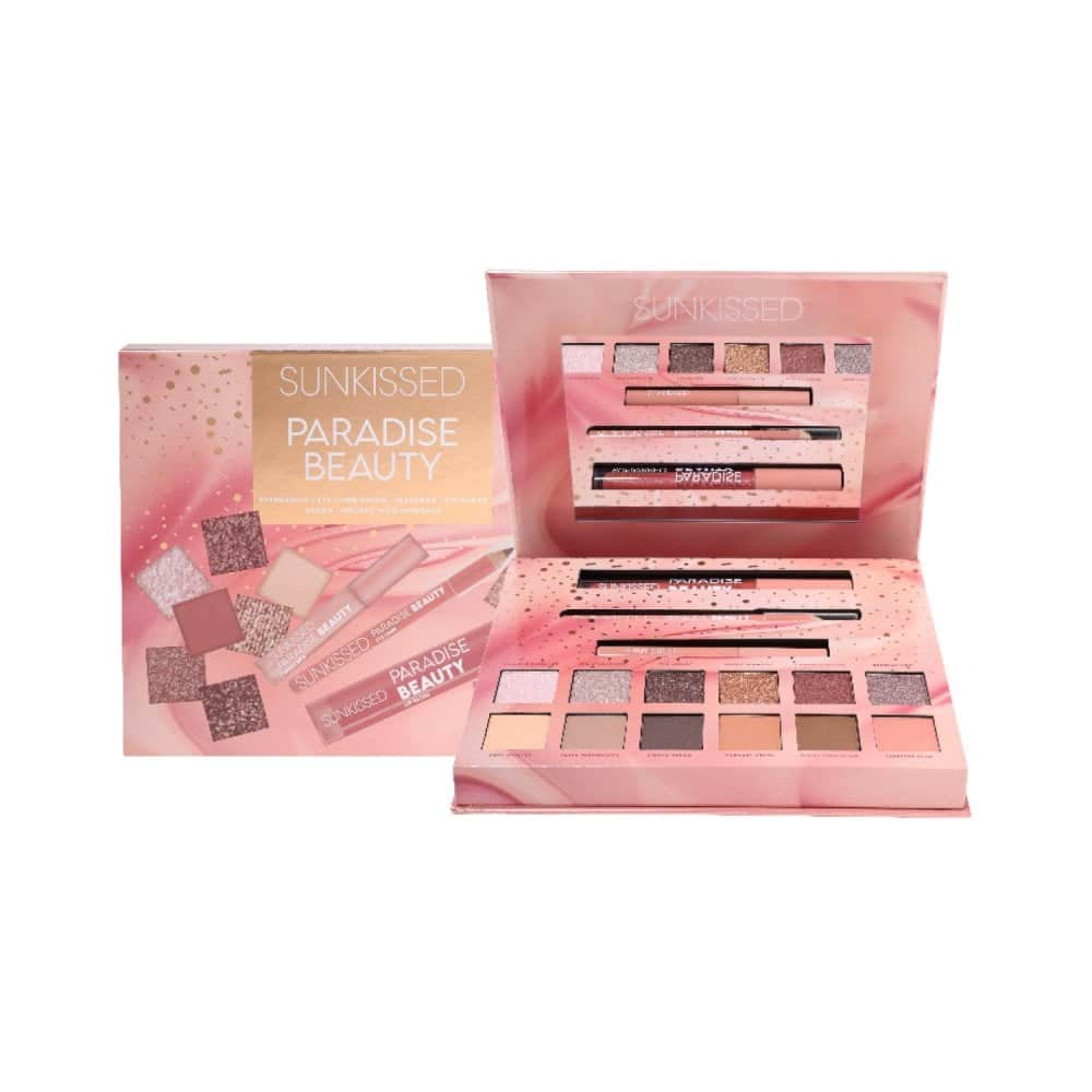 Elevate your beauty routine with Sunkissed Paradise Set: eyeshadow, mascara, eyeliner, and lip gloss!