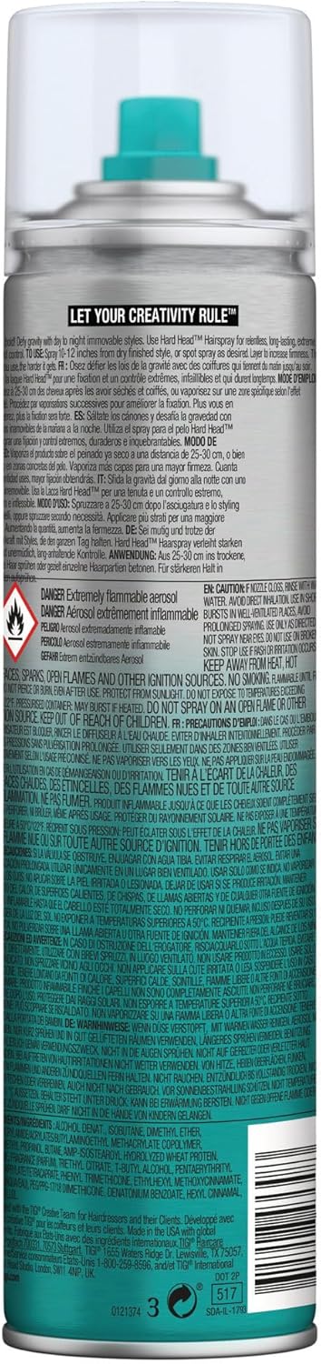 Tigi Bed Head Hard Head Hairspray comes in a convenient 385 ml aerosol can, perfect for both home use and travel. To maintain optimal performance, store in a cool, dry place and ensure the nozzle is clean to prevent clogs. This product is formulated for all hair types and is suitable for both men and women.