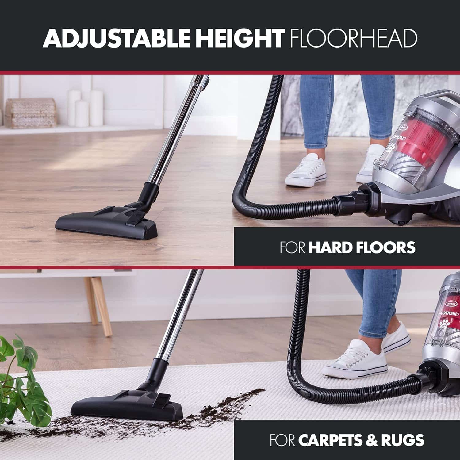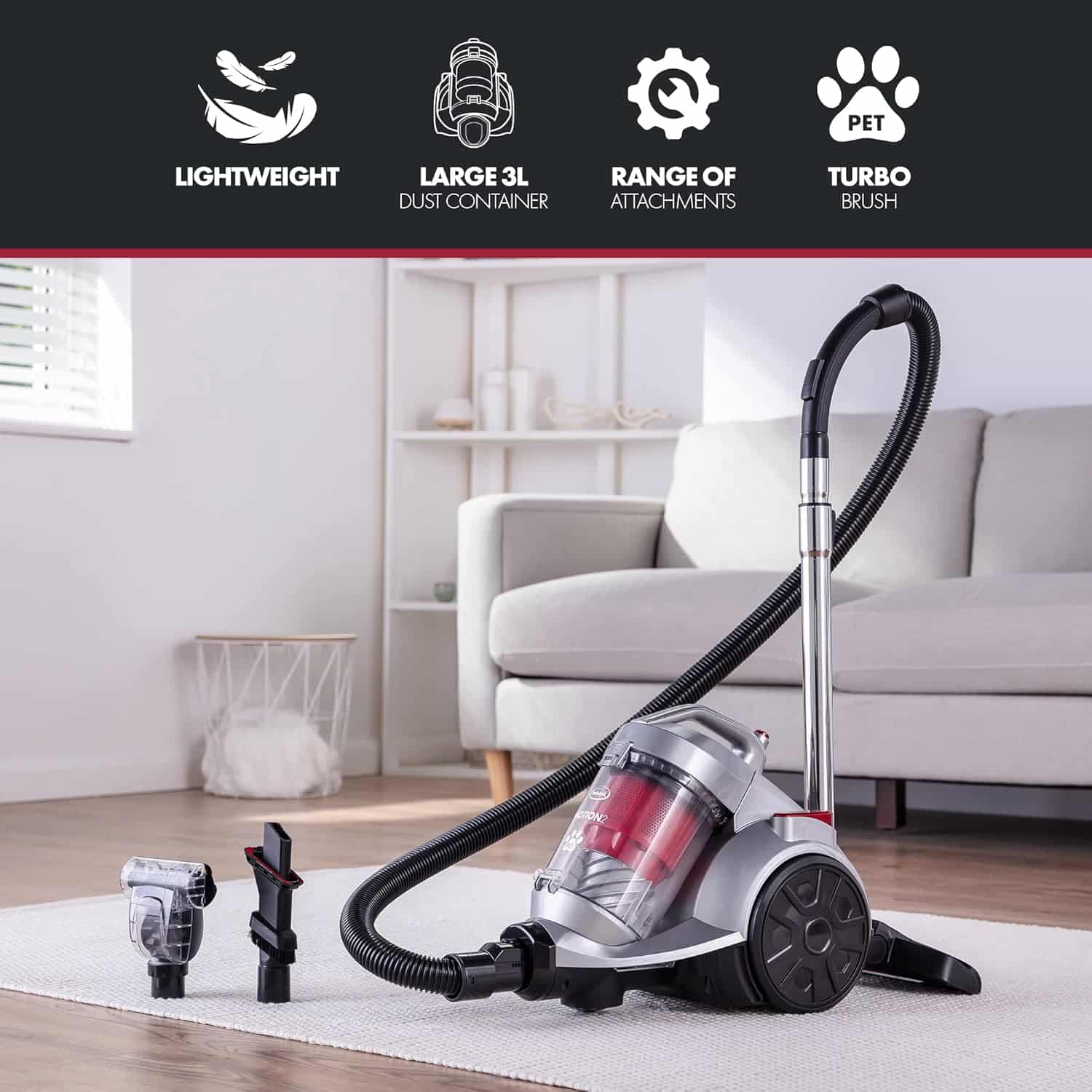 Introducing the Ewbank EW3130 Motion2 Pet 3 L Bagless Cylinder Vacuum Cleaner in a sleek silver and red design, a powerful cleaning solution designed specifically for pet owners and households with high traffic areas. This vacuum cleaner combines advanced technology with user-friendly features, ensuring that every corner of your home remains spotless while making your cleaning routine more efficient.