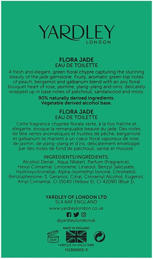 Yardley Flora Jade is made from high-quality ingredients, ensuring a fragrance that is both delightful and safe for everyday use. The elegant glass bottle design not only enhances the aesthetic but also provides ease of use with its convenient spray mechanism. For best results, store in a cool, dry place, away from direct sunlight to preserve the fragrance's integrity.