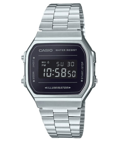 Timeless Casio A168 digital watch: sleek silver design, reliable performance, affordable style.